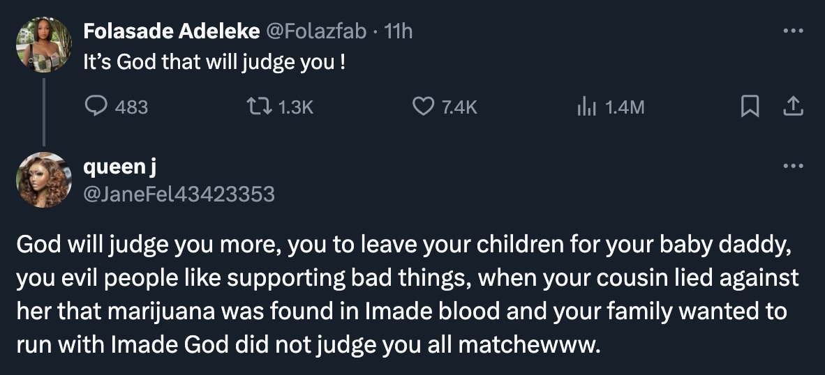 “God will judge you more, you to leave your children for your baby daddy, you evil people like supporting bad things, when your cousin lied against her that marijuana was found in Imade blood and your family wanted to run with Imade God did not judge you all matchewww,” the troll wrote.