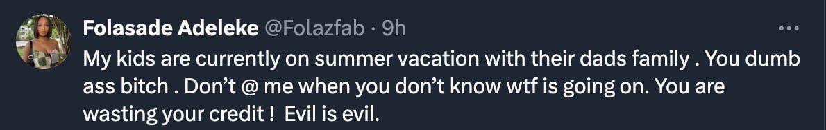 “My kids are currently on summer vacation with their dads family . You dumb ass bitch . Don’t @ me when you don’t know wtf is going on. You are wasting your credit ! Evil is evil,” she noted.