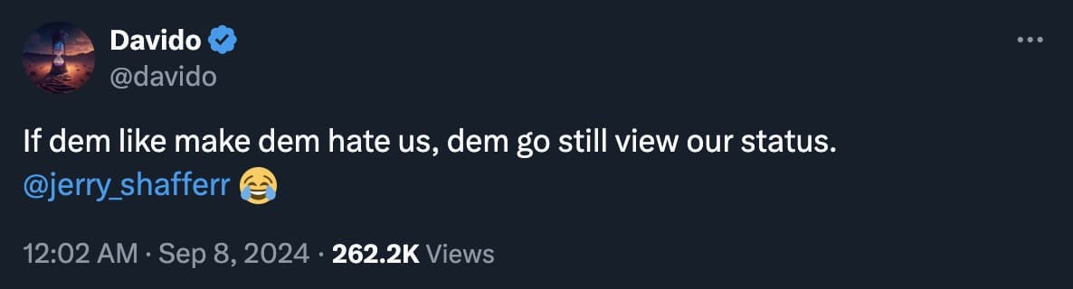 “If dem like make dem hate us, dem go still view our status. @jerry_shafferr,” he wrote.