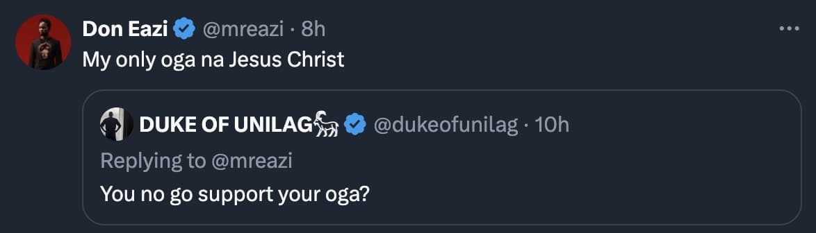 Mr Eazi responded, “My only oga na Jesus Christ.”