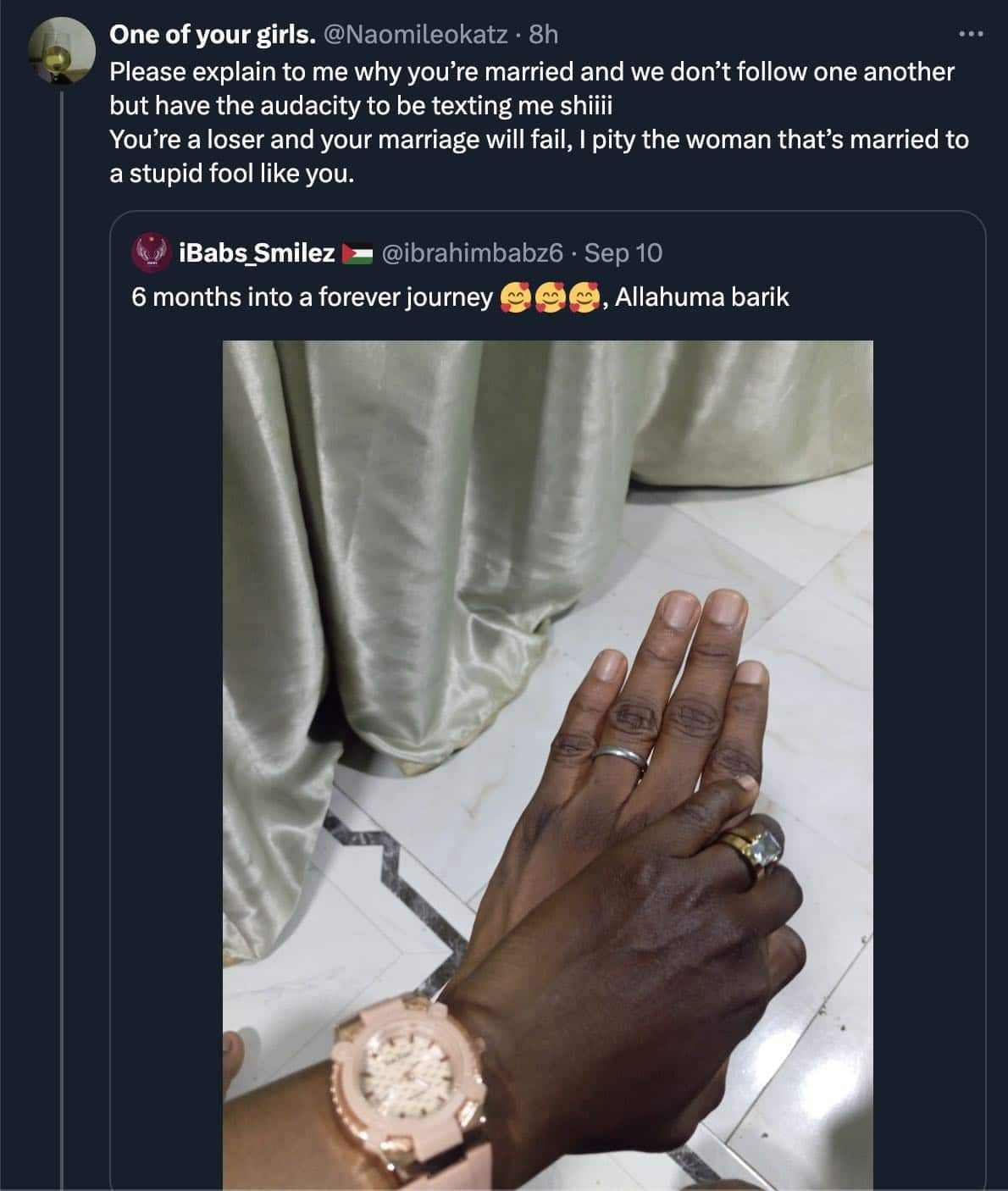 You’re a loser and your marriage will fail, I pity the woman that’s married to a stupid fool like you,” she wrote in a tweet.