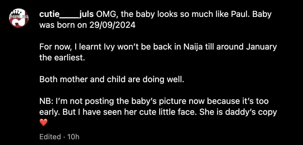 “OMG, the baby looks so much like Paul. Baby was born on 29/09/2024. For now, I learnt Ivy won’t be back in Naija till around January the earliest. Both mother and child are doing well.