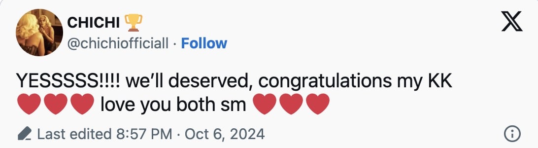 Taking to X (formerly Twitter) to share her excitement, Chichi congratulated KellyRae and his wife, Kassia stating that his victory was well-deserved.