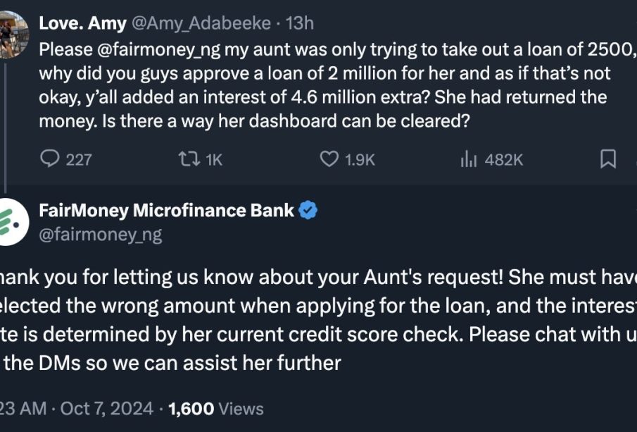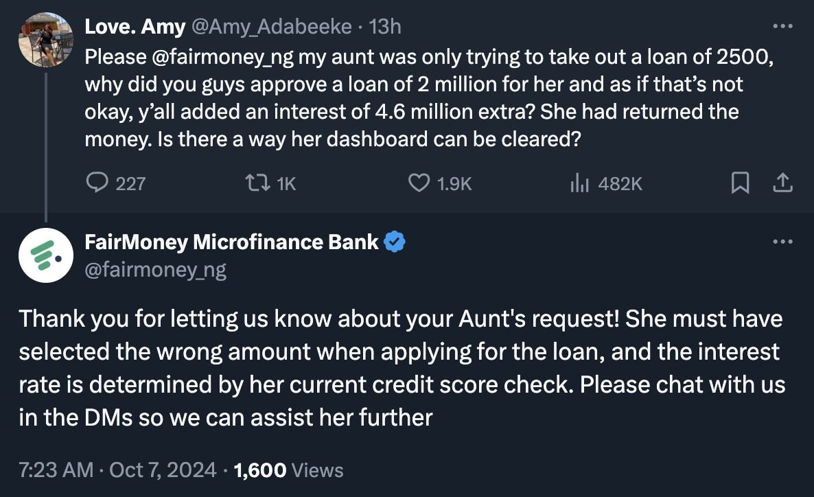 In a public reply via X, FairMoney stated: “Thank you for letting us know about your Aunt’s request! She must have selected the wrong amount when applying for the loan, and the interest rate is determined by her current credit score check. Please chat with us in the DMs so we can assist her further.”