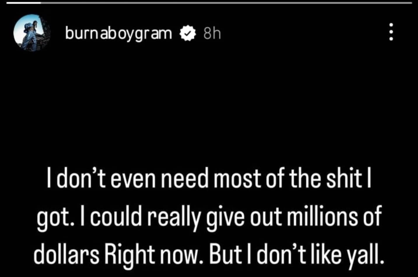 Referring to his general dislike for people on social media, Burna Boy stated, “I don’t even need most of the shit I got. I could really give out millions of dollars right now. But I don’t like y’all.”