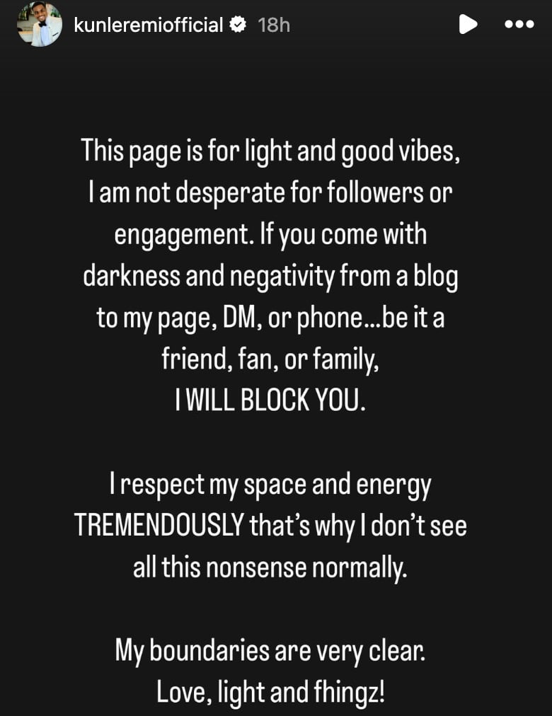 While Kunle Remi did not directly address the specific allegations, his message emphasized his desire to maintain a positive online space.