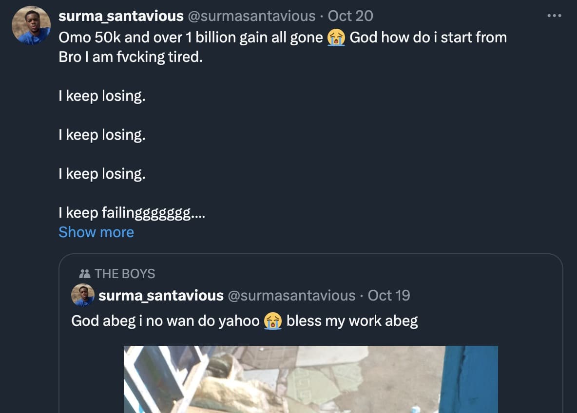 Sharing an update later, he quoted the post, lamenting his loss, “Omo 50k and over 1 billion gain all gone God how do i start from. Bro I am fvcking tired. I keep losing. I keep losing. I keep losing. I keep failinggggggg. Why tf is the universe like this. I am done. I am literally done. Goodbye all of you. Fccccckkkingg done. .”