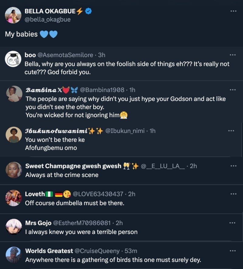 Some fans of Bella ran to her defence, stating, “Imagine her only hyping her Godson same people will drag for not hyping the other son, now she hype both they’re still dragging her it’s well with you people.”