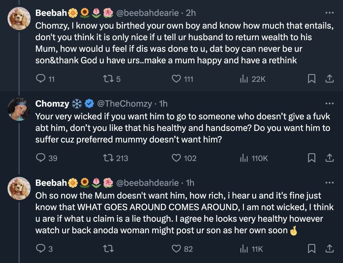 A troll wrote, “Chomzy, I know you birthed your own boy and know how much that entails, don’t you think it is only nice if u tell ur husband to return wealth to his Mum, how would u feel if dis was done to u, dat boy can never be ur son&thank God u have urs..make a mum happy and have a rethink.”