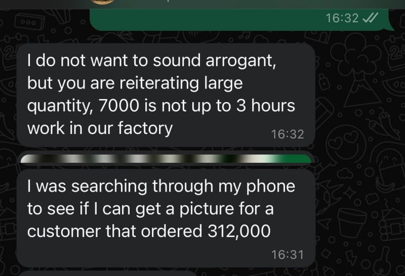 “I ordered 7000 packs of an item from a Nigerian brand. I asked for a discount as the amount quoted was the retail amount. Their response: ‘I do not want to sound arrogant, but 7000 is not up to 3 hours work in our factory. No discount.’