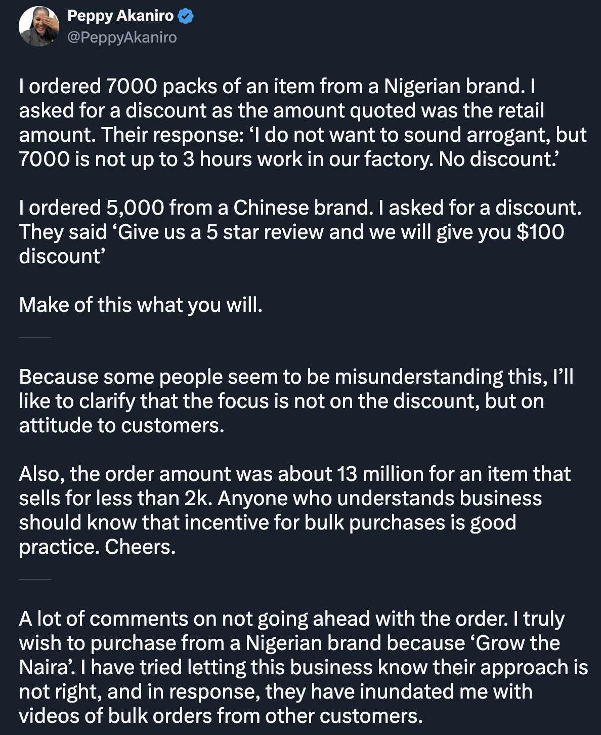 An X user identified as @PeppyAkaniro recounted how she placed an order, totalling around 13 million Naira, which prompted her to seek a discount.