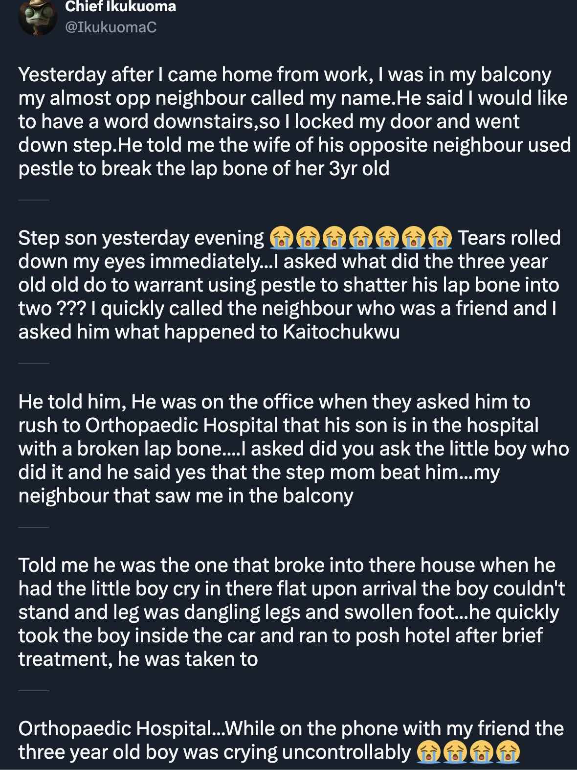 According to the post, @ikukuomac was alerted by a neighbour upon returning home from work about the toddler being unable to stand and in immense pain.