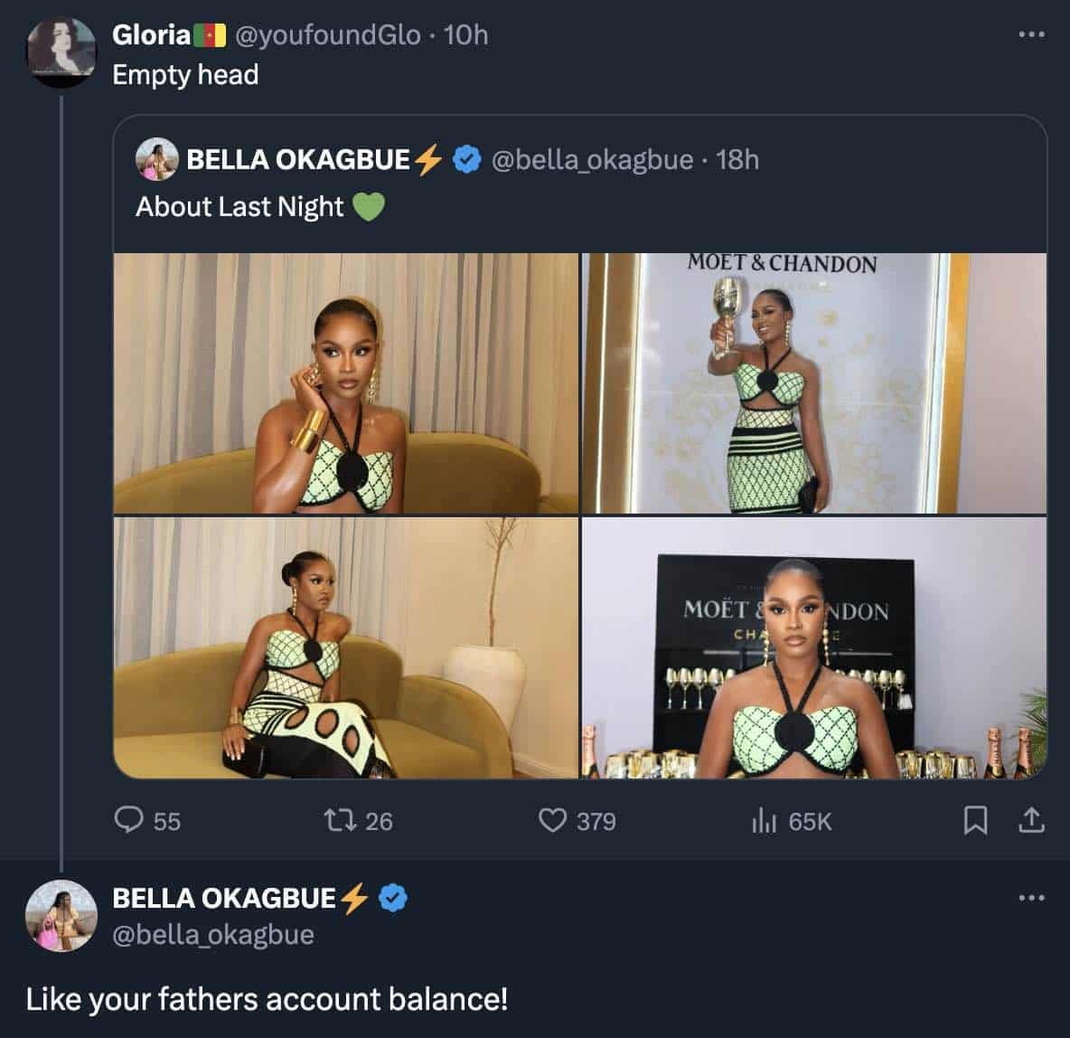 Bella Okagbue sparks a buzz for broke-shaming a troll’s father