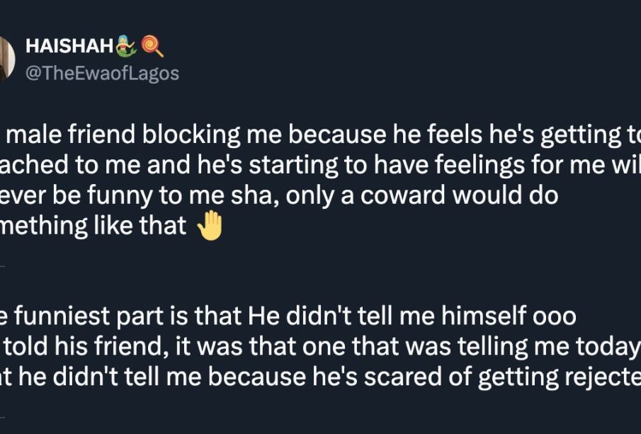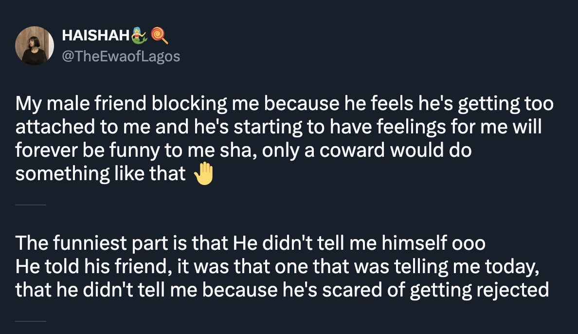 “My male friend blocking me because he feels he’s getting too attached to me and he’s starting to have feelings for me will forever be funny to me sha, only a coward would do something like that .