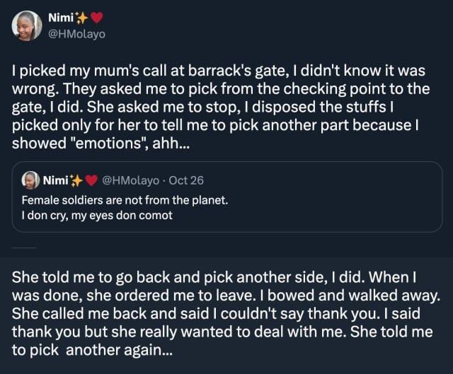 The lady identified as @HMolayo on X narrated being reprimanded for picking up a call from her mother at the barrack’s gate, unaware that it was against protocol.