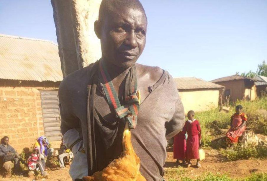 In a show of public reprimand, the man was made to stand by a pole with the chicken tied around his neck to serve as a warning to him and others.