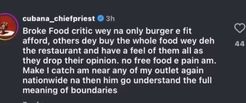 The chat stated, “Broke Food critic wey na only burger e fit afford, others dey buy the whole food wey deh the restaurant and have a feel of them all as they drop their opinion. no free food e pain am. Make I catch am near any of my outlet again nationwide na then him go understand the full meaning of boundaries.”