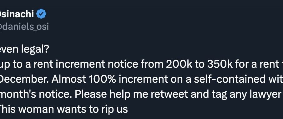 He wrote, “Is this even legal? I woke up to a rent increment notice from 200k to 350k for a rent that’s due in December. Almost 100% increment on a self-contained with less than a month’s notice. Please help me retweet and tag any lawyer you know. This woman wants to rip us.”