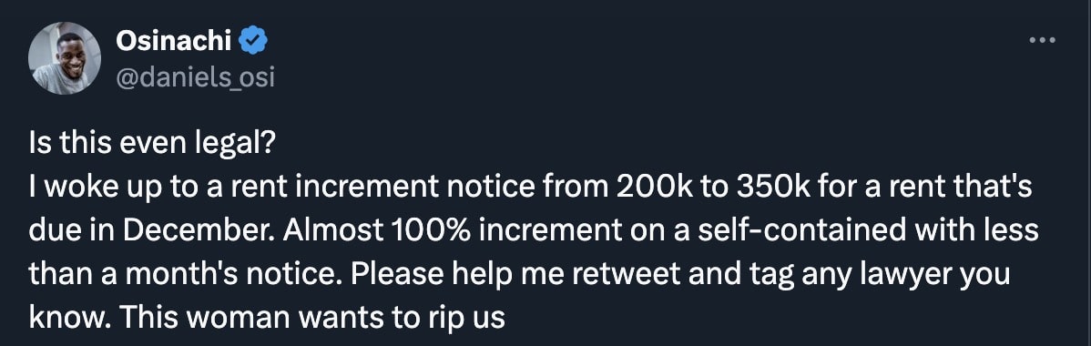 He wrote, “Is this even legal? I woke up to a rent increment notice from 200k to 350k for a rent that’s due in December. Almost 100% increment on a self-contained with less than a month’s notice. Please help me retweet and tag any lawyer you know. This woman wants to rip us.”