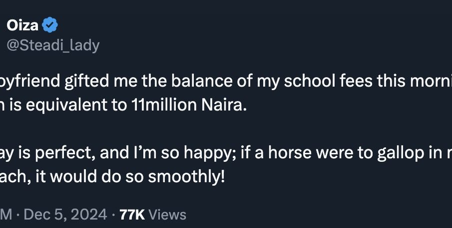 “My boyfriend gifted me the balance of my school fees this morning, which is equivalent to ₦11 million. My day is perfect, and I’m so happy; if a horse were to gallop in my stomach, it would do so smoothly!”