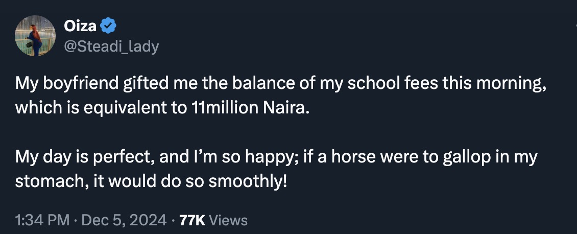 “My boyfriend gifted me the balance of my school fees this morning, which is equivalent to ₦11 million. My day is perfect, and I’m so happy; if a horse were to gallop in my stomach, it would do so smoothly!”