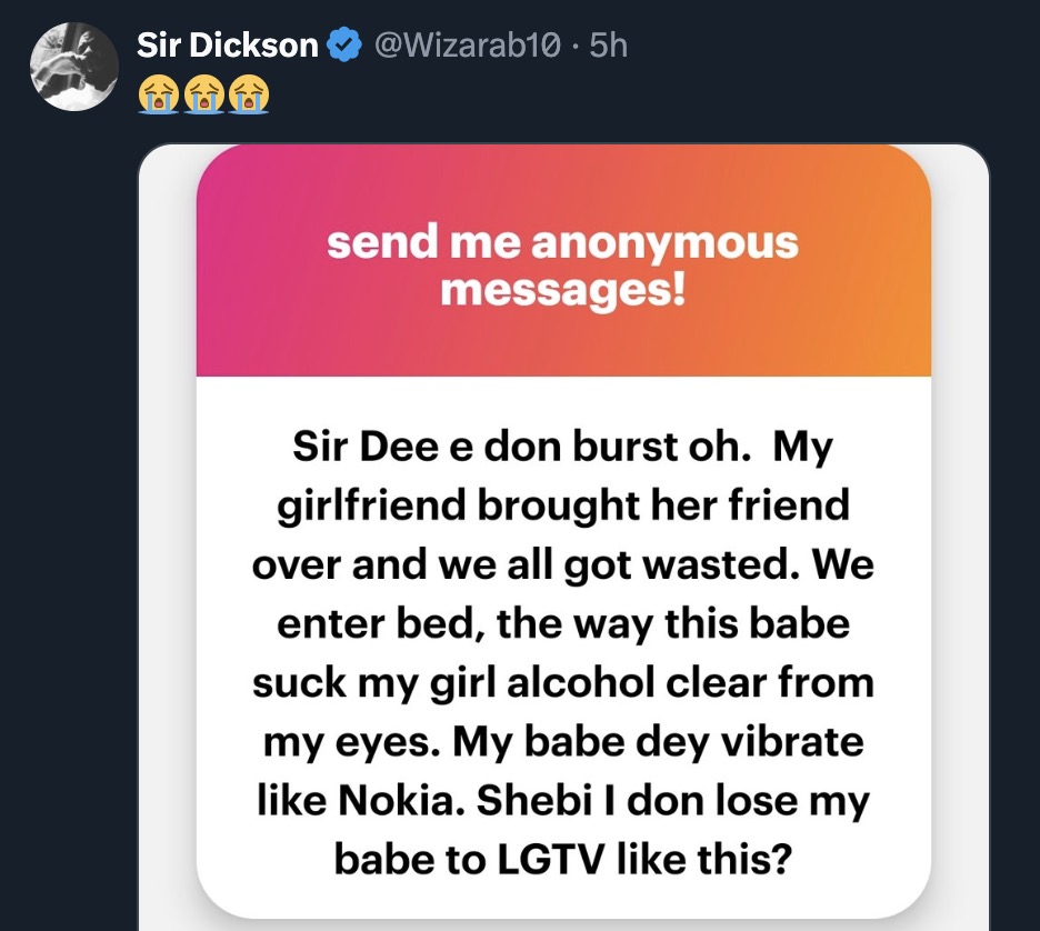 “Sir Dee e don burst oh. My girlfriend brought her friend over and we all got wasted. We enter bed, the way this babe suck my girl alcohol clear from my eyes. My babe dey vibrate like Nokia. Shebi I don lose my babe to LGTV like this?”