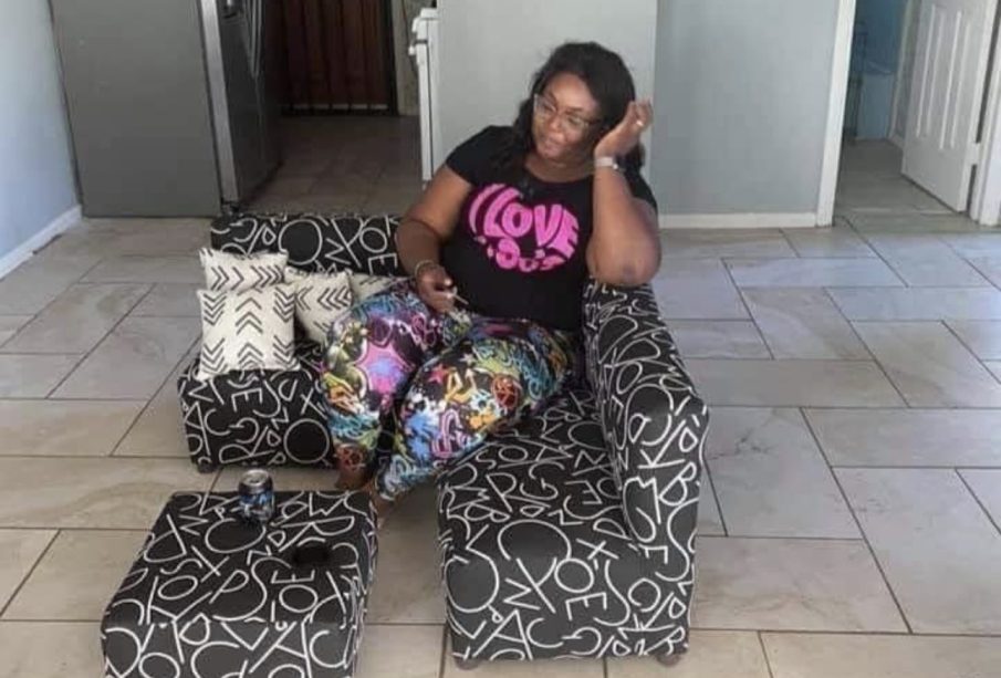 A lady flaunts the living room set her neighbor received after she ordered it from an online store.