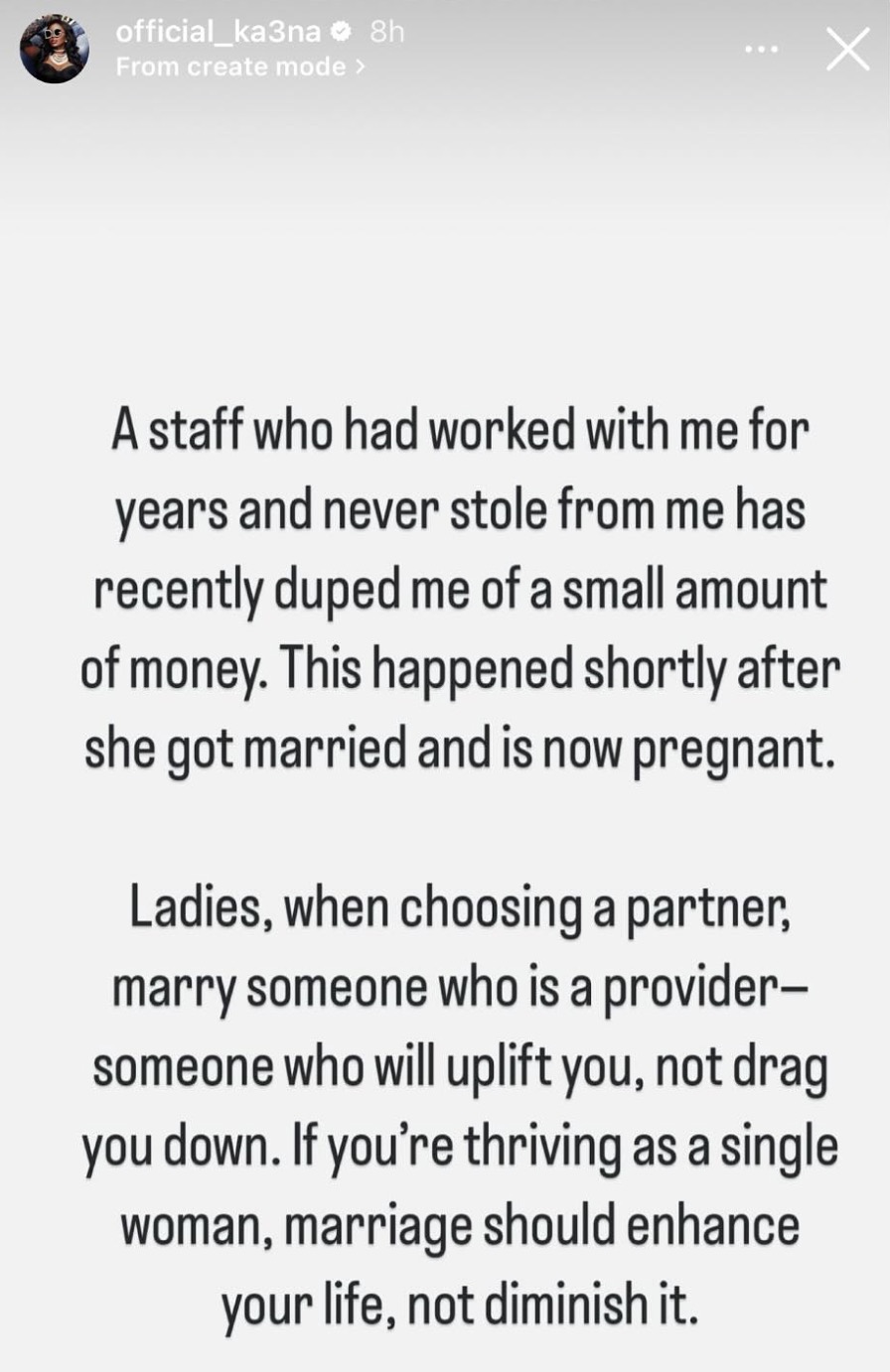“A staff who had worked with me for years and never stole from me has recently duped me of a small amount of money. This happened shortly after she got married and is now pregnant,” Ka3na narrated.