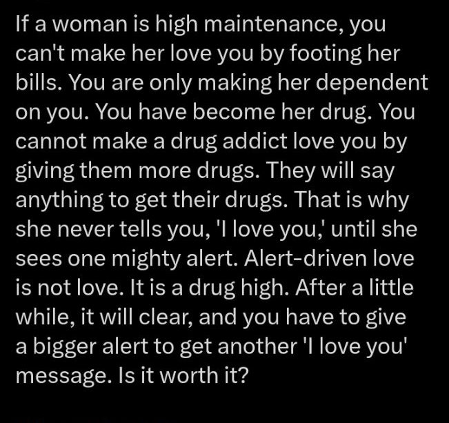 He stated, “If a woman is high maintenance, you can’t make her love you by footing her bills. You are only making her dependent on you. You have become her drug.