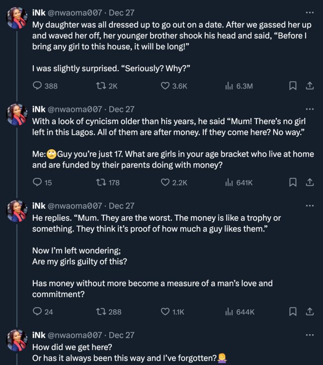 Twitter user @nwaoma007 recounted the moment when her son expressed frustration with girls his age, claiming, “There’s no girl left in this Lagos. All of them are after money.”