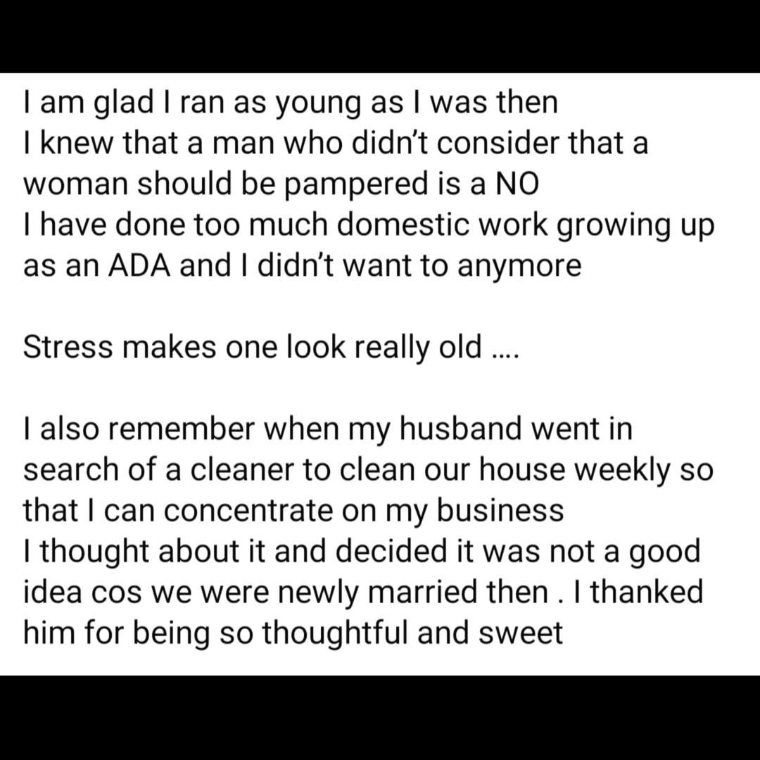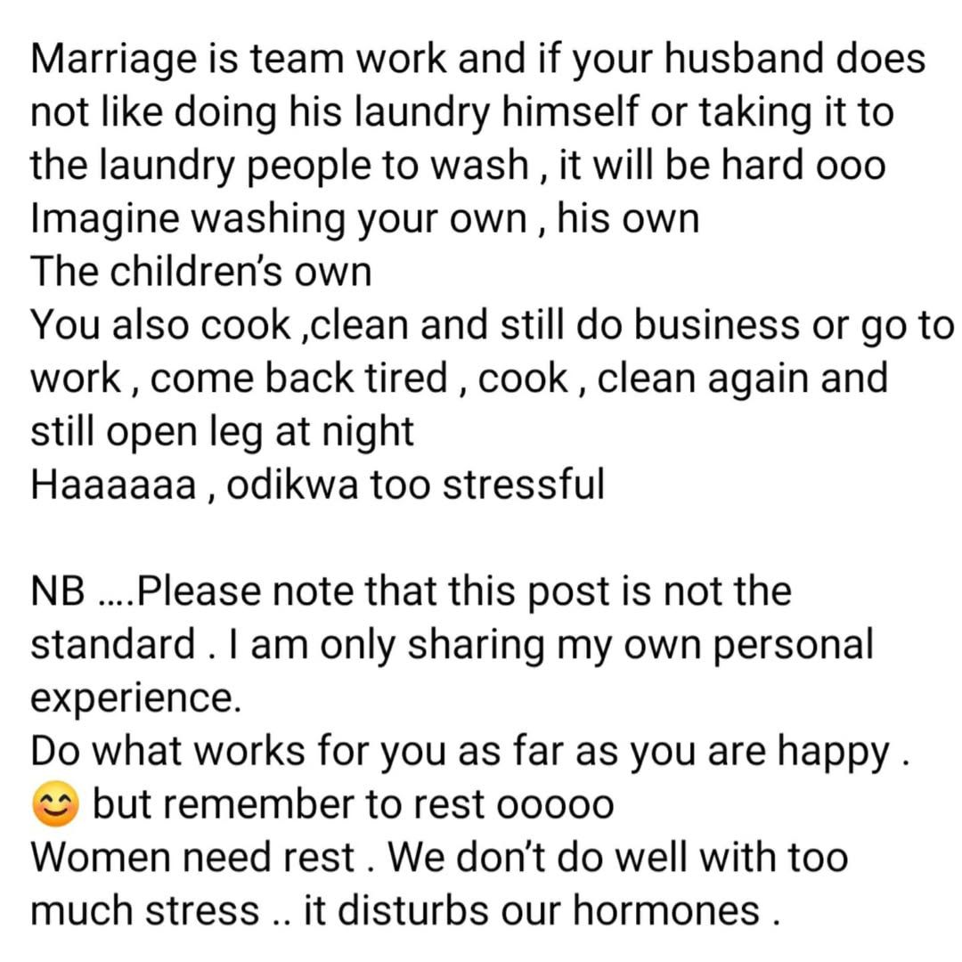 According to her, her husband hates to stress her so he takes their clothes to the laundry so she can have time to focus on her business.