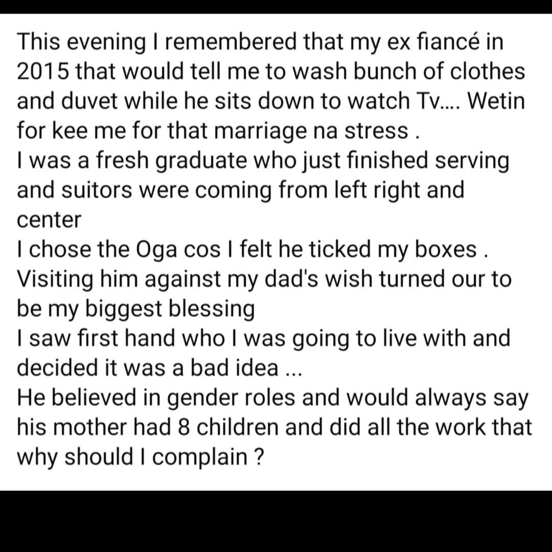She revealed that her husband is a sharp opposite to her ex fiance who she revealed, would leave her to wash bunch of clothes and Duvet, while he sits down to watch TV.