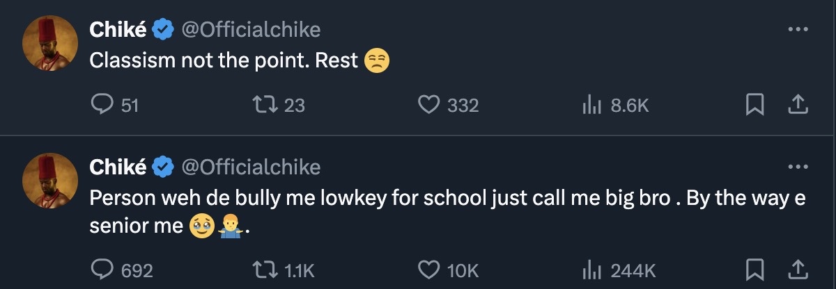 The post sparked reactions among fans, with some accusing Chike of being “classist” in his remarks. Responding to the criticism, Chike clarified his stance, saying, “Classism not the point. Rest.”