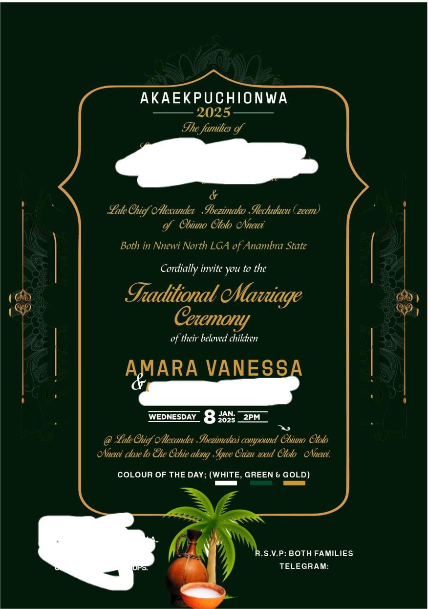 A young Nigerian lady has surprised her family and friends by cancelling her traditional wedding scheduled for January 8, 2025, in Otolo, Nnewi.