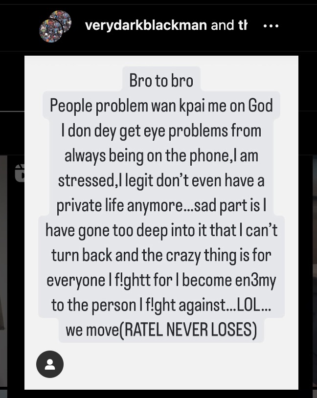 “Bro to bro, people’s problems wan kpai me on God. I don dey get eye problems from always being on the phone. I’m stressed. I legit don’t even have a private life anymore.