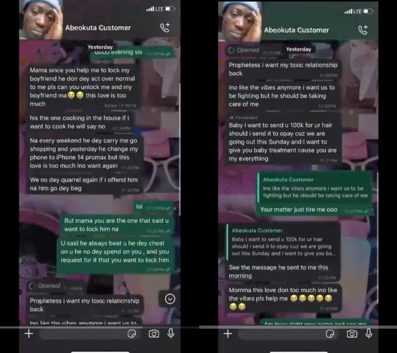 “His the one cooking in the house if i want to cook he will say no. Na every weekend he dey carry me go shopping and yesterday he change my phone to iPhone 14 promax but this love is too much ino want again. We no dey quarrel again if i offend him na him go dey beg. Prophetess i want my toxic relationship back,” she added.