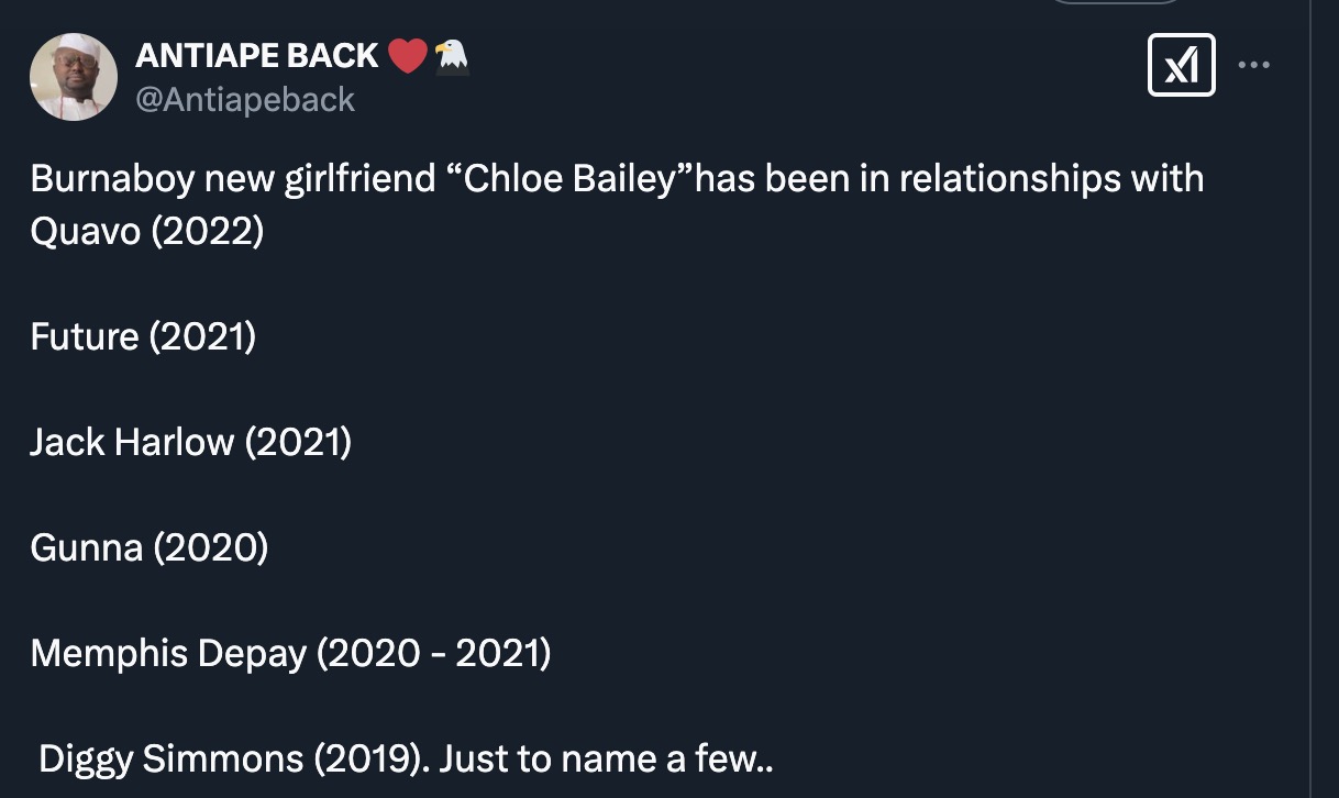 A Nigerian man has sparked controversy after compiling a list of American singer Chloe Bailey’s alleged past relationships over the last six years, following her confirmed romance with Burna Boy.