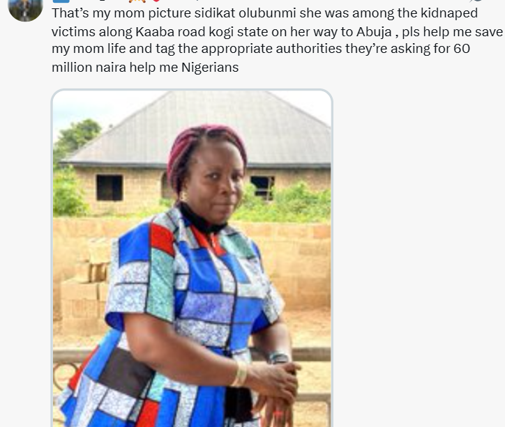 The heartbroken son, identified on X as @dope_demonxx, said his mother was on a commercial bus heading to Abuja when kidnappers struck in Kabba.