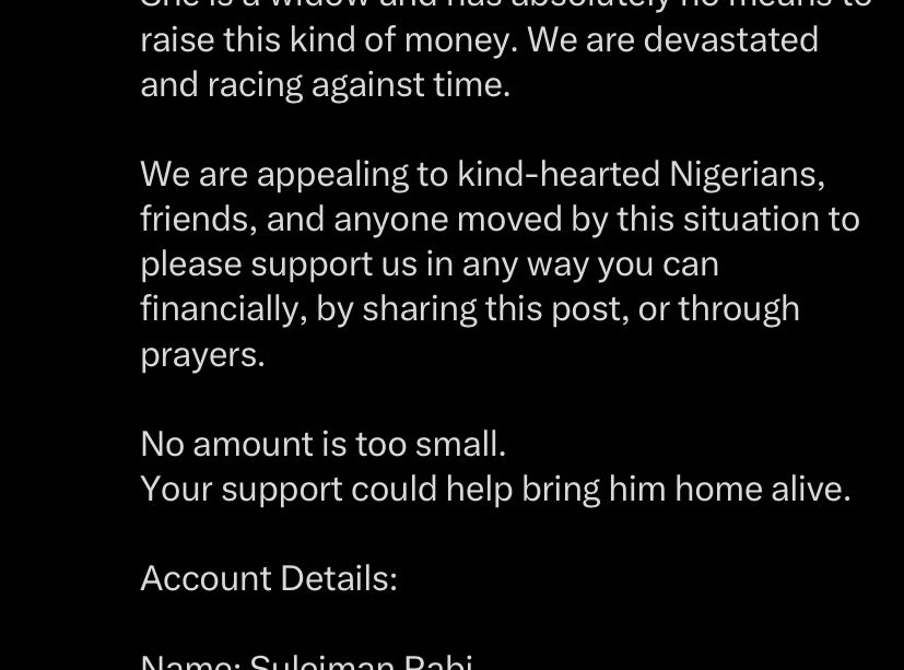 She wrote: “Yesterday, along Obajana Road in Kogi State, an 18-seater bus heading to school was attacked, and everyone on board was kidnapped, including my husband’s cousin. The kidnappers have contacted his mother and are demanding ₦100 million for his release. We tried to negotiate with them, but they said we were not ready and ended the call. She is a widow and has absolutely no means to raise such an amount. We are devastated and racing against time. We appeal to kind-hearted Nigerians, friends, and anyone moved by this situation to support us in any way possible—financially, by sharing this post, or through prayers. No amount is too small. Your support could help bring him home alive.
