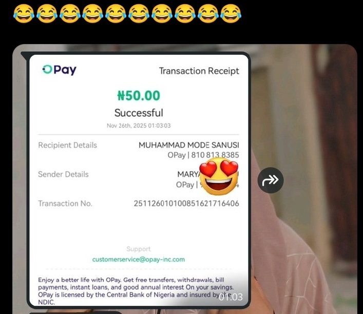 In his tweet, @sarkinnomaa shared screenshot of a 50‑naira credit alert from his girlfriend, along with a screenshot of the transaction.