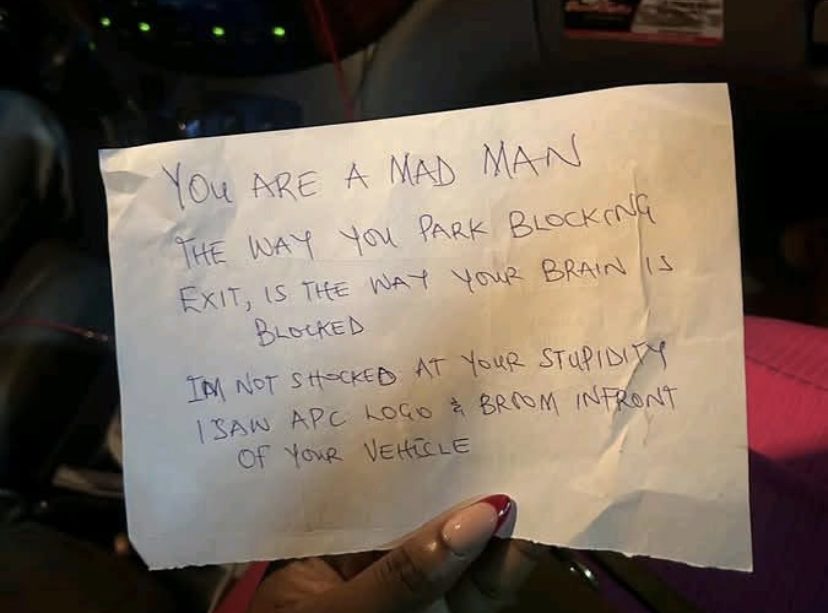 The note read: “You are a mad man. The way you park blocking exit, is the way your brain is blocked. I’m not shocked at your stupidity. I saw APC logo and broom in front of your vehicle.”