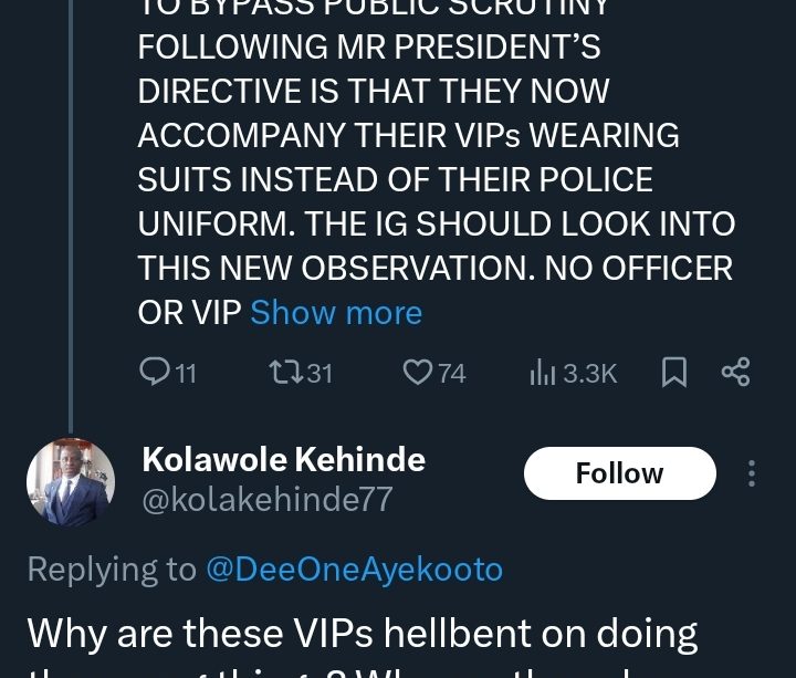 A man has sparked mixed reactions on social media after claiming that some police officers attached to VIPs now wear suits while escorting, insisting that the action undermines President Bola Tinubu’s directive.