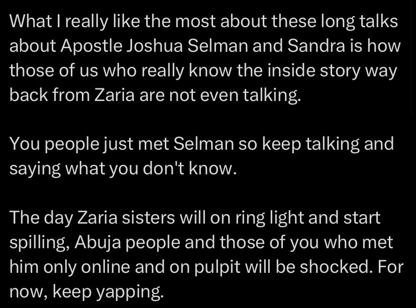 “What I really like the most about these long talks about Apostle Joshua Selman and Sandra is how those of us who really know the inside story way back from Zaria are not even talking. You people just met Selman so keep talking and saying what you don’t know. The day Zaria sisters will on ring light and start spilling, Abuja people and those of you who met him only online and on pulpit will be shocked. For now, keep yapping. Anyways bye.”