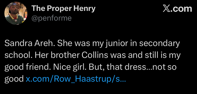 In his words: “Sandra Areh. She was my junior in secondary school. Her brother Collins was and still is my good friend. Nice girl. But, that dress. Not so good.”
