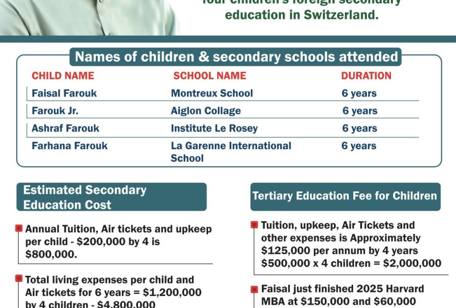 He also highlighted the alleged tertiary education expenses of Ahmed’s children, noting that tuition, upkeep, airfare, and other costs averaged about $125,000 per year over a four-year period.