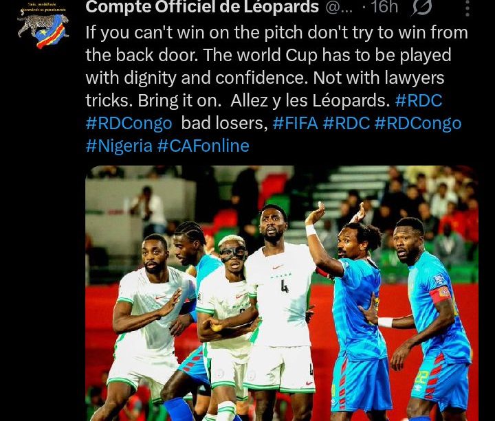 Via its official X page, FECOFA blasted Nigeria, calling them “bad losers” who couldn’t qualify for the 2026 FIFA World Cup on merit and were now trying to use legal tricks to get in.