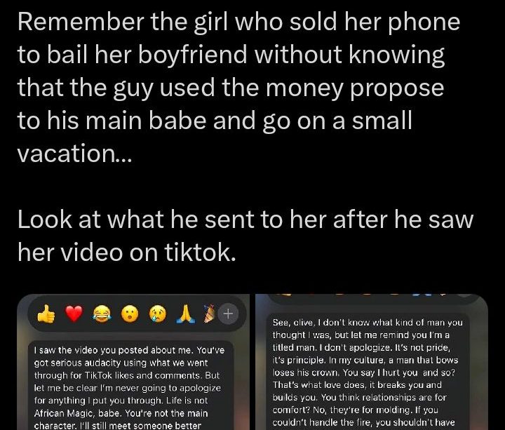 ‎The heartbreaking incident was shared by @lifesochard, a user on X (formerly Twitter), who posted a series of texts the lady received from her ex-boyfriend who betrayed her.