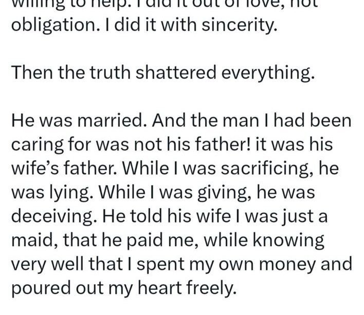 He was married. And the man I had been caring for was not his father! it was his wife’s father. While I was sacrificing, he was lying. While I was giving, he was deceiving. He told his wife I was just a maid, that he paid me, while knowing very well that I spent my own money and poured out my heart freely.