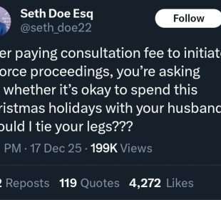 GistReel A lawyer has sparked reactions on social media after he revealed how a lady who had already initiated a divorce demanded ...Lady who initiated divorce demands to spend Christmas with her husband