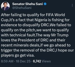 GistReel Former Kaduna Central Senator Shehu Sani has warned Nigeria against relying on technical grounds to disqualify the Democratic Republic of Congo ...“We failed to qualify on pitch, we want to qualify with technical fault… Trump loves ...